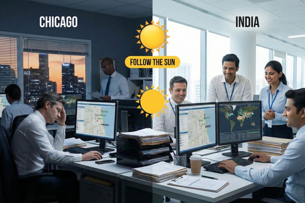 iRapidO designed a "Follow the Sun" Remote Capability Center. Unlike traditional BPO models where processes are black-boxed, this solution gave the client full management authority over a dedicated team in India, ensuring the same SOPs used in Chicago were executed globally.